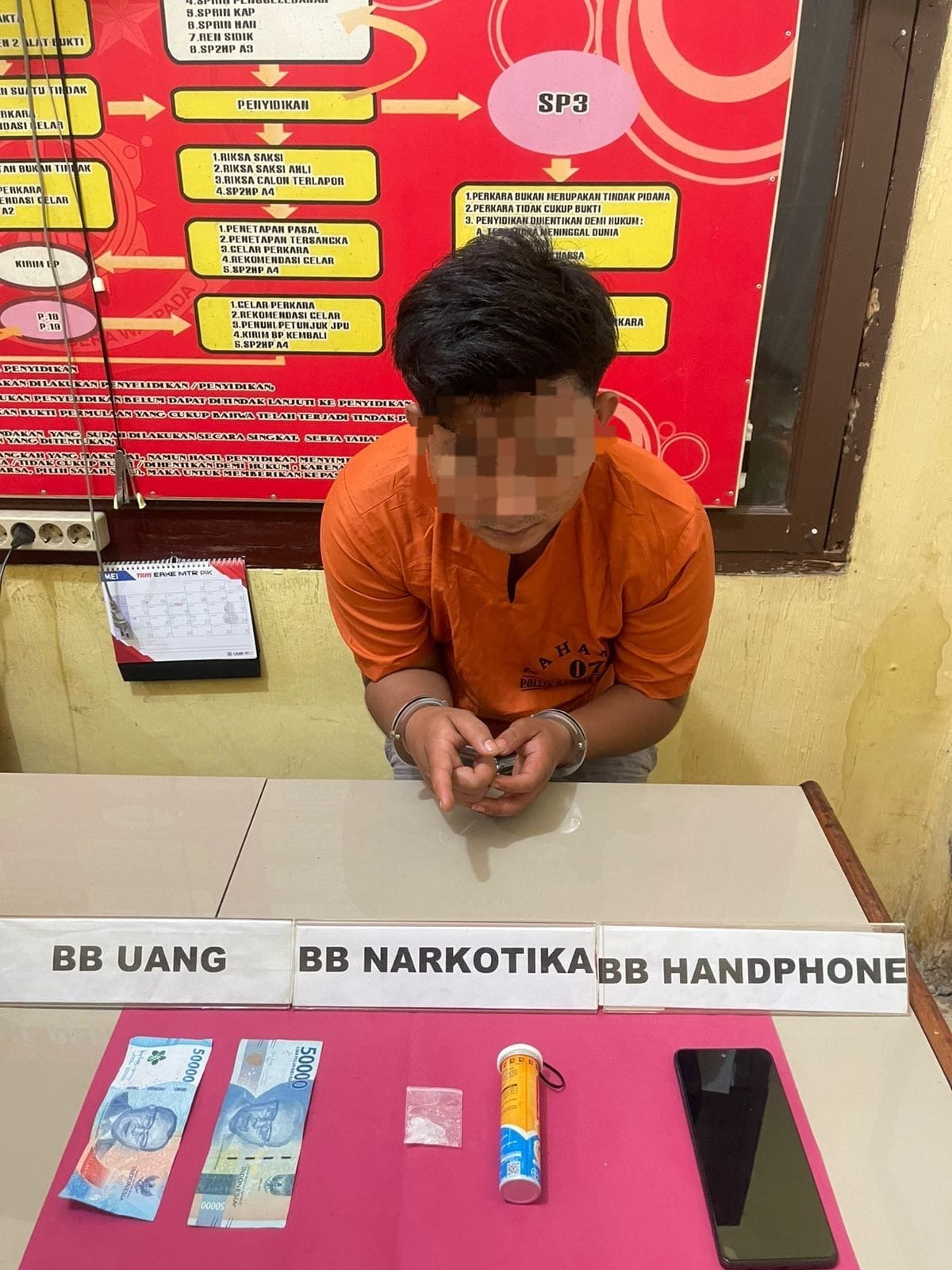 “Dari hasil penggeledahan yang dilakukan dengan disaksikan oleh Ketua Dusun setempat, tim menemukan satu paket narkotika jenis sabu yang dibungkus dengan plastik bening di dalam botol merk REDOXON warna Kuning, sebuah handphone merk OPPO A3x warna Ungu dan uang sejumlah Rp. 100.000,-,” jelas IPTU Irwan.