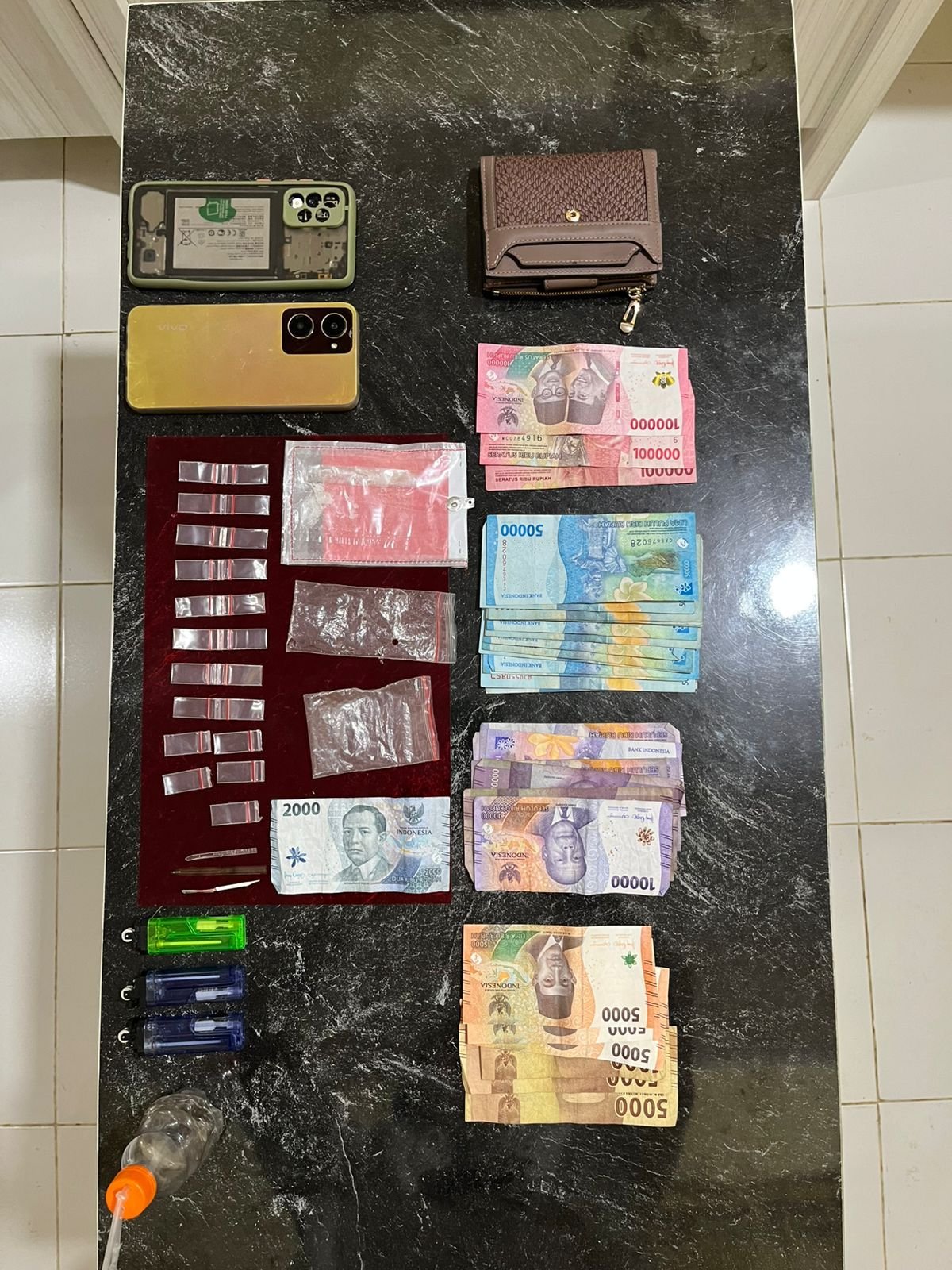 Saat penggeledahan awal, Team menemukan 1 (satu) Buah Kaca Phirex yang masih melekat pada 1 (satu) Buah Alat Hisap Bong terbuat dari botol plastik putih bening beserta uang Tunai sebanyak Rp. 1.110.000 (Satu Juta Seratus Sepuluh Ribu Rupiah) didalam 1 (satu) Buah Dompet warna Coklat dan 3 (tiga) Buah Mancis.